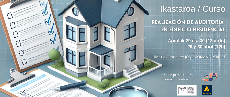 "AUDITORIA EGITEA EGOITZA ERAIKINEAN" IKASTAROA (12 ordu) Objeto: Tras la realización de dos edificios del curso básico de auditorias realizado en el año 2021 y el 2022 en el Colegio de Arquitectos de Bilbao, tras la solicitud de numerosos compañeros que asistieron al curso de la realización de un ejemplo práctico en el que se realice una auditoria al completo, el ...