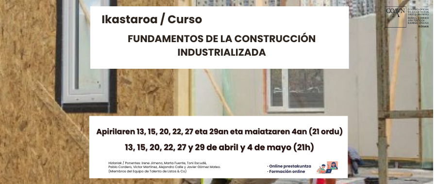 IKASTAROA "FUNDAMENTOS DE LA CONSTRUCCIÓN INDUSTRIALIZADA" Esta formación está diseñada para profesionales en el ámbito de la arquitectura, la ingeniería y la construcción que buscan profundizar en las últimas tendencias y tecnologías del sector.Impartido por expertos en activo con una amplia experiencia en diversas áreas de la construcción industrializada, los sistemas constructivos, sus procesos de digitalización y aplicaciones concretas en proyectos reales. ...